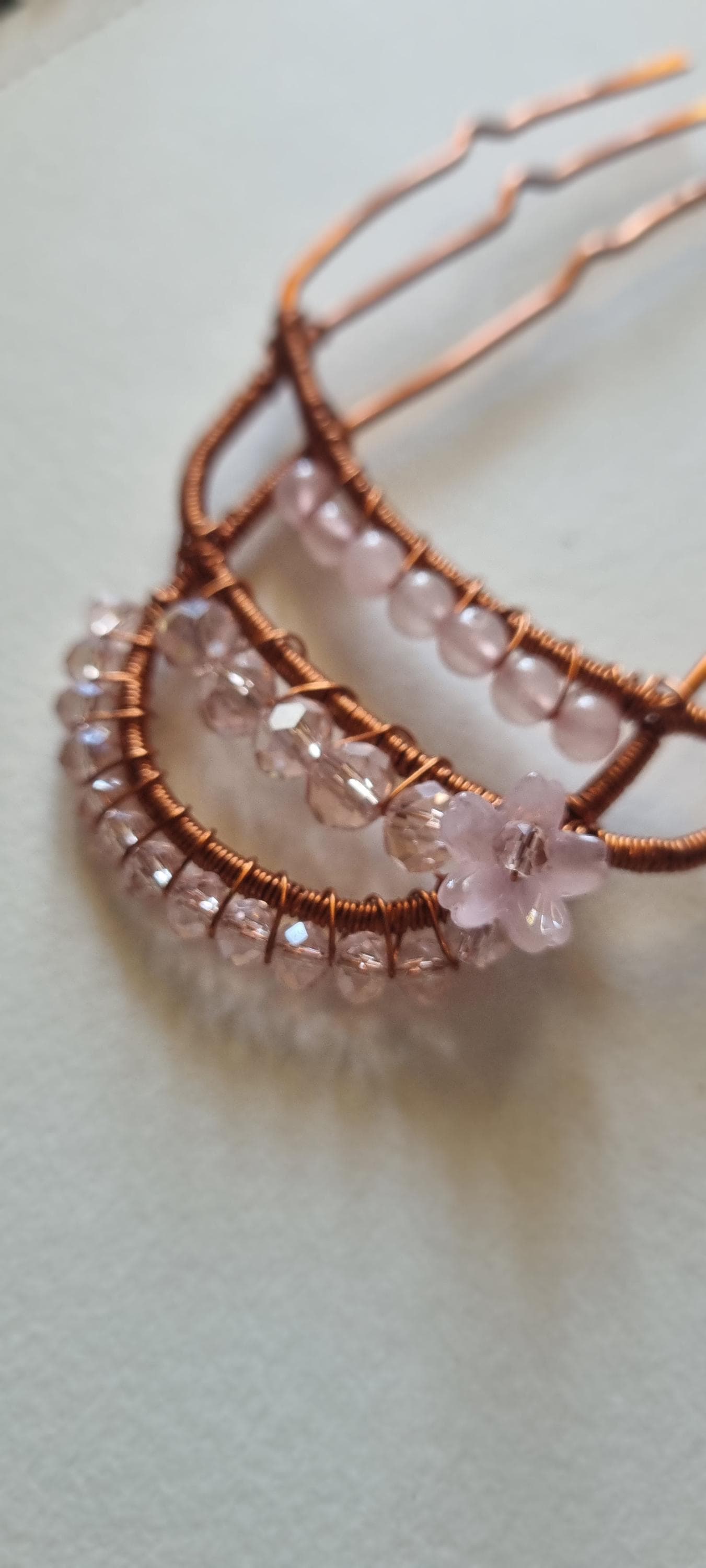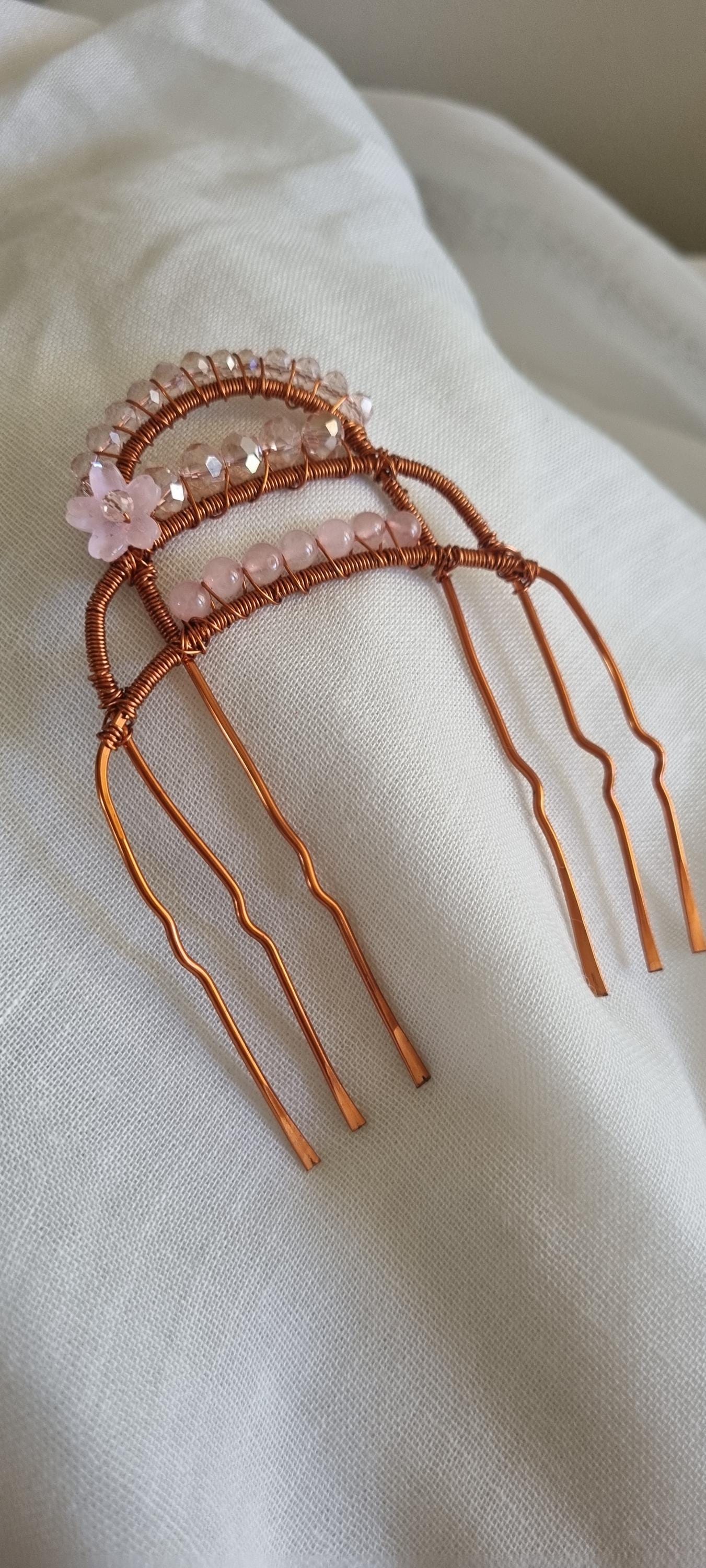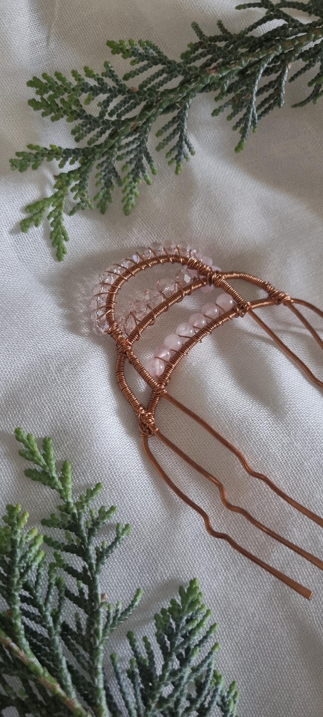 Add a touch of soft feminine magic to your hairstyle with this handcrafted wire hair pin. Designed with warm copper tones and delicate rose-light beads, this piece creates a dreamy, ethereal look perfect for weddings, special occasions, or everyday goddess energy.
