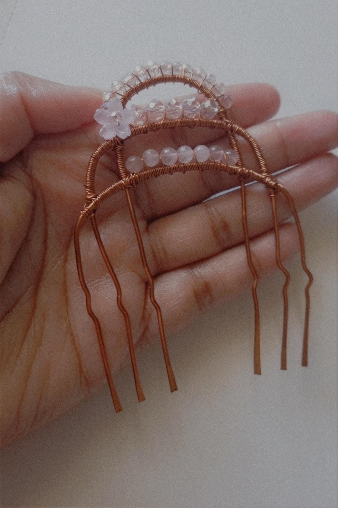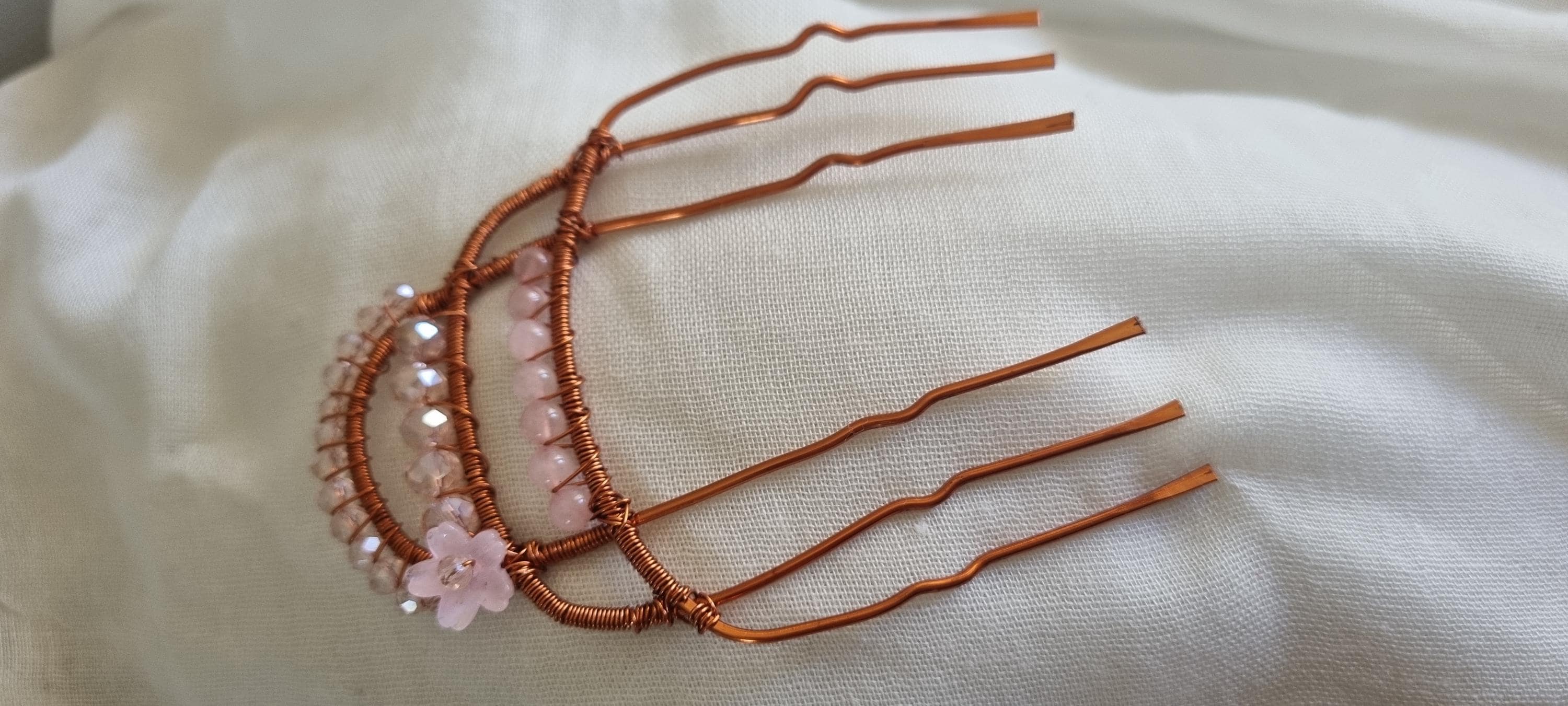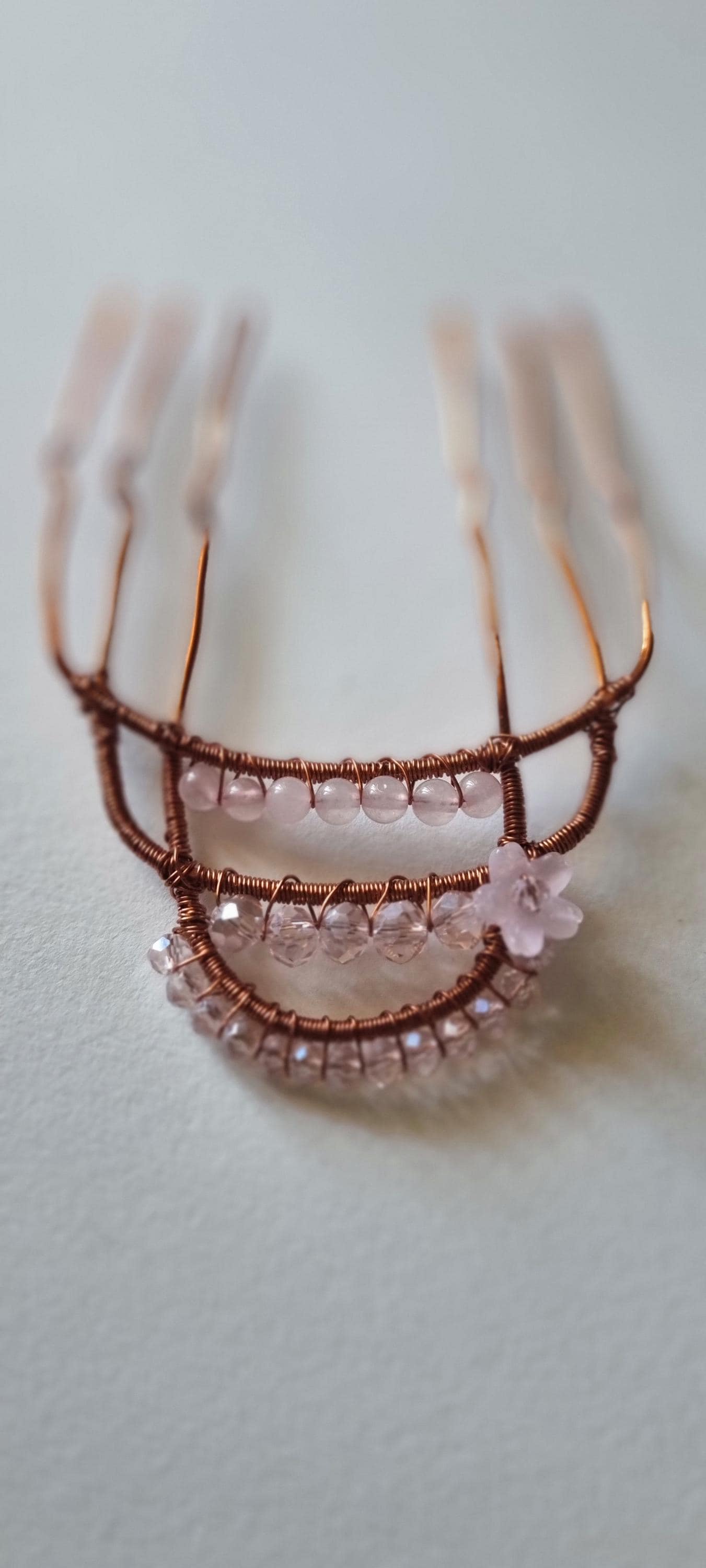 Add a touch of soft feminine magic to your hairstyle with this handcrafted wire hair pin. Designed with warm copper tones and delicate rose-light beads, this piece creates a dreamy, ethereal look perfect for weddings, special occasions, or everyday goddess energy.